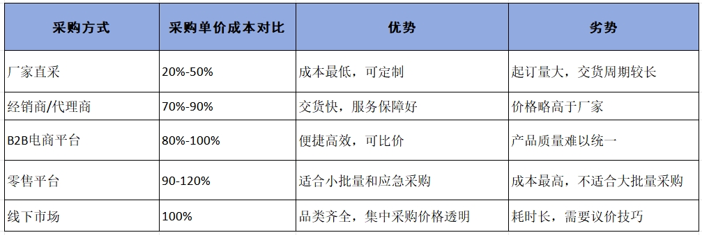 根據(jù)行業(yè)研究數(shù)據(jù)和市場調(diào)查,不同渠道采購方式的成本對比如下: